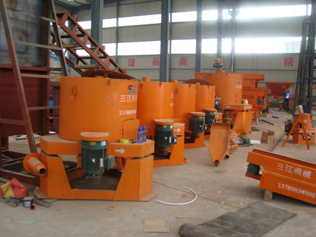本設(shè)備是代替汞板的沙金富集設(shè)備,處理量為10-12T/h,配用動力7.5kw6極電動機(jī)一臺,外筒直徑1.1米,設(shè)備總高1.58米,給礦粒度0.4-0.6mm,給礦濃度為30%,凈選率在90%以上,設(shè)備總重約1000kg.